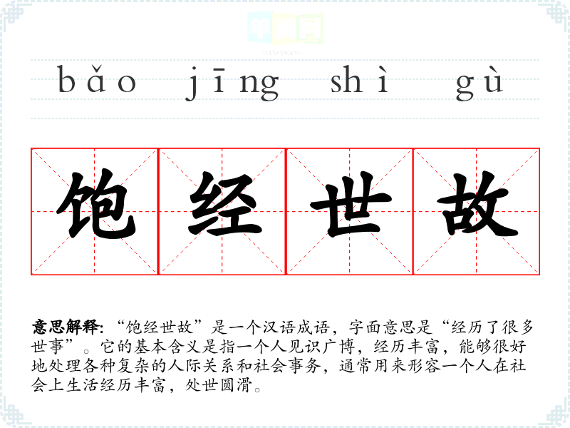 “饱经世故”是一个汉语成语,字面意思是“经历了很多世事”。它的基本含义是指一个人见识广博,经历丰富,能够很好地处理各种复杂的人际关系和社会事务,通常用来形容一个人在社会上生活经历丰富,处世圆滑。