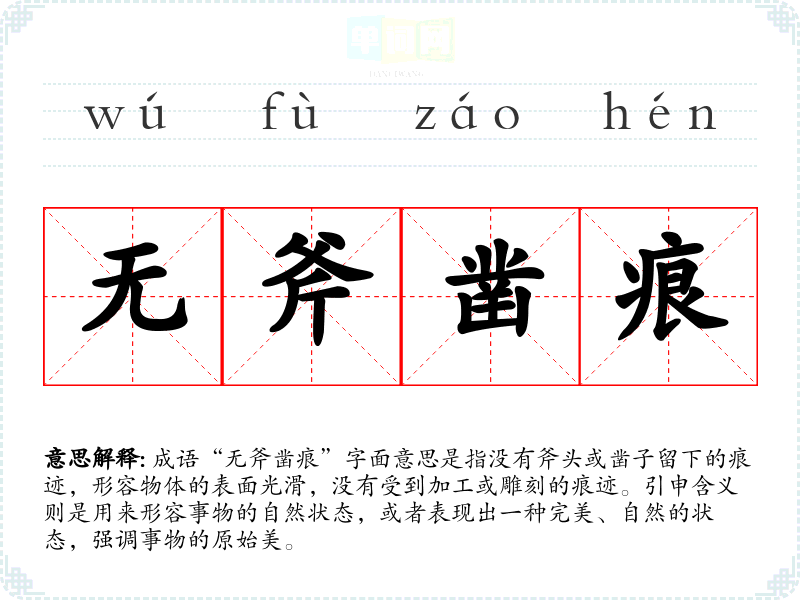 成语“无斧凿痕”字面意思是指没有斧头或凿子留下的痕迹,形容物体的表面光滑,没有受到加工或雕刻的痕迹。引申含义则是用来形容事物的自然状态,或者表现出一种完美、自然的状态,强调事物的原始美。