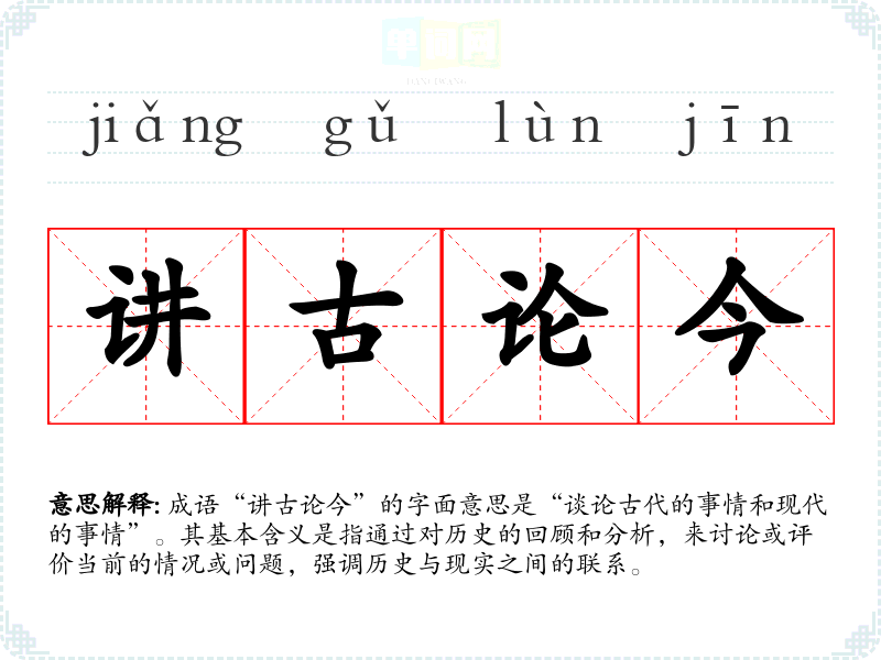 成语“讲古论今”的字面意思是“谈论古代的事情和现代的事情”。其基本含义是指通过对历史的回顾和分析,来讨论或评价当前的情况或问题,强调历史与现实之间的联系。