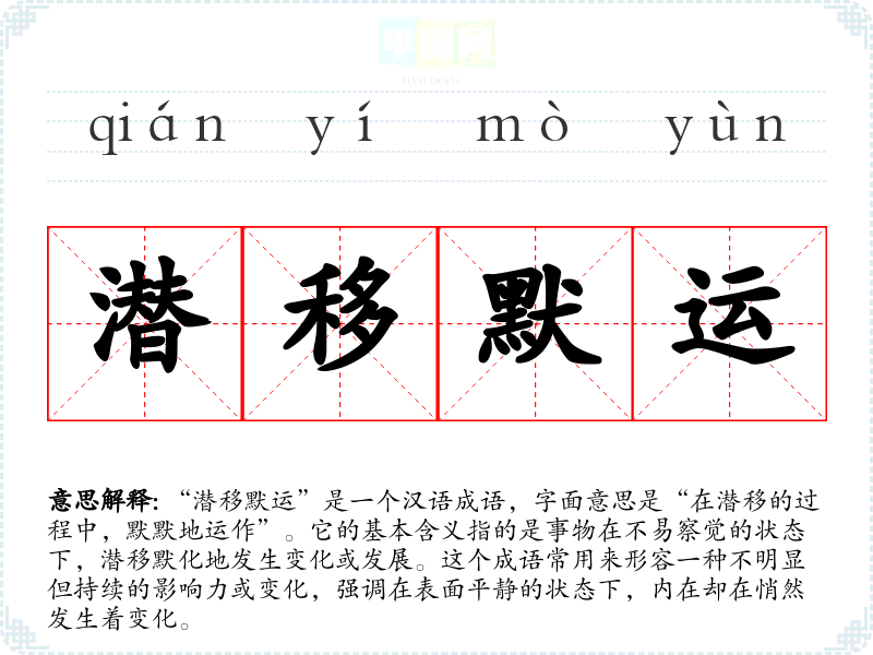“潜移默运”让我联想到人生中的种种变化,很多时候我们并不能立刻意识到某种影响,但随着时间的推移,慢慢地会发现这些积累的改变。它给人一种温和而深刻的感觉,提醒我们要关注那些细微却重要的变化。