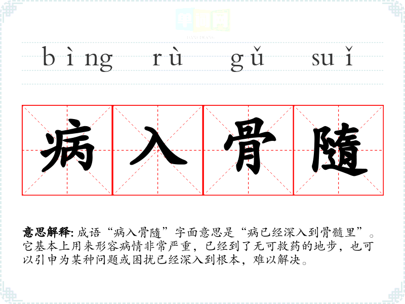 成语“病入骨隨”字面意思是“病已经深入到骨髓里”。它基本上用来形容病情非常严重,已经到了无可救药的地步,也可以引申为某种问题或困扰已经深入到根本,难以解决。