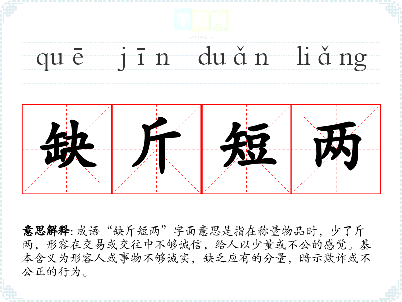 成语“缺斤短两”字面意思是指在称量物品时,少了斤两,形容在交易或交往中不够诚信,给人以少量或不公的感觉。基本含义为形容人或事物不够诚实,缺乏应有的分量,暗示欺诈或不公正的行为。