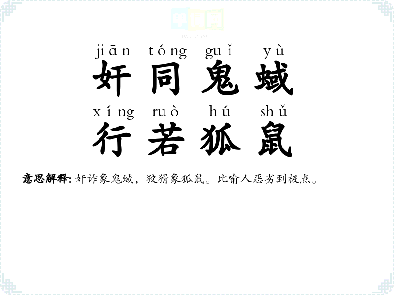 | 奸同鬼蜮,行若狐鼠 | 奸诈象鬼蜮,狡猾象狐鼠。比喻人恶劣到极点。 |