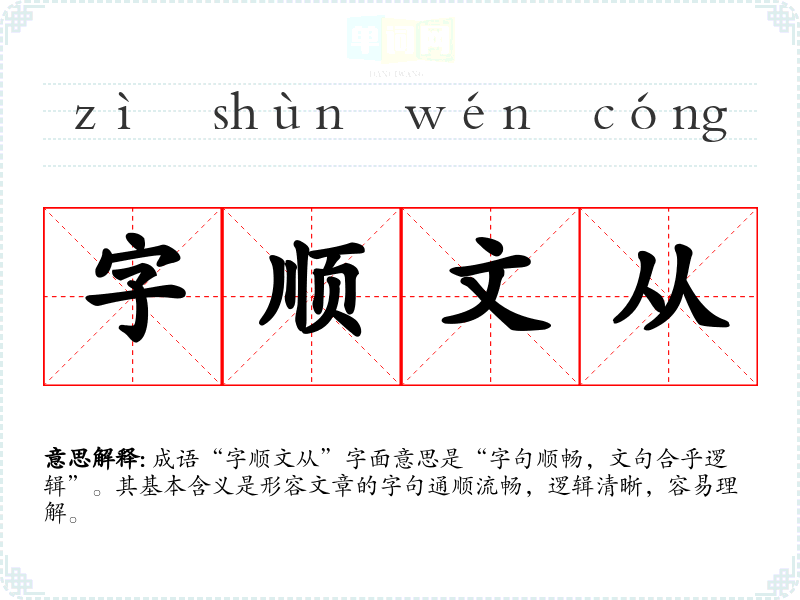 成语“字顺文从”字面意思是“字句顺畅,文句合乎逻辑”。其基本含义是形容文章的字句通顺流畅,逻辑清晰,容易理解。