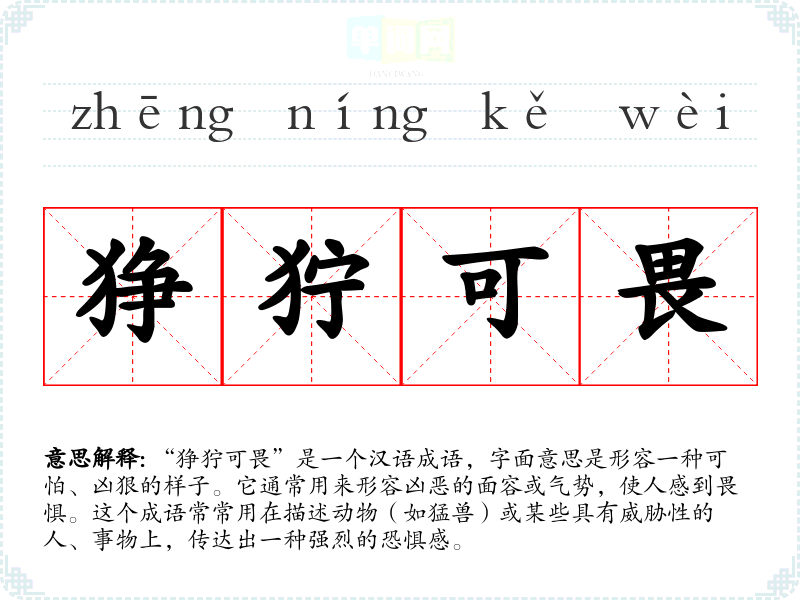 “狰狞可畏”是一个汉语成语,字面意思是形容一种可怕、凶狠的样子。它通常用来形容凶恶的面容或气势,使人感到畏惧。这个成语常常用在描述动物(如猛兽)或某些具有威胁性的人、事物上,传达出一种强烈的恐惧感。