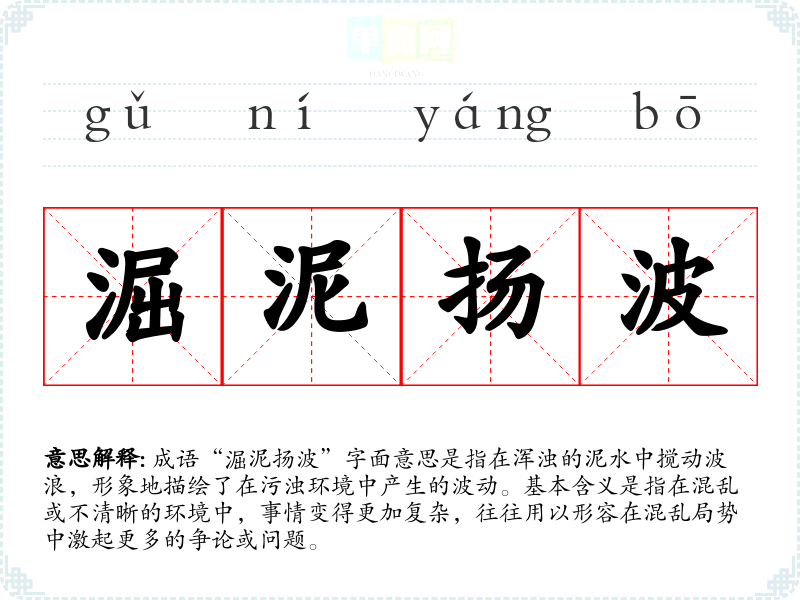 成语“淈泥扬波”字面意思是指在浑浊的泥水中搅动波浪,形象地描绘了在污浊环境中产生的波动。基本含义是指在混乱或不清晰的环境中,事情变得更加复杂,往往用以形容在混乱局势中激起更多的争论或问题。