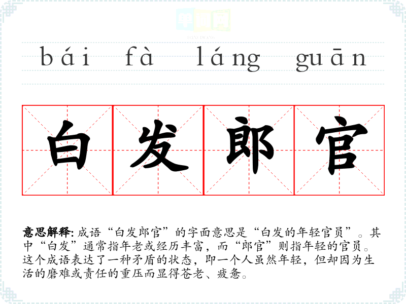 成语“白发郎官”的字面意思是“白发的年轻官员”。其中“白发”通常指年老或经历丰富,而“郎官”则指年轻的官员。这个成语表达了一种矛盾的状态,即一个人虽然年轻,但却因为生活的磨难或责任的重压而显得苍老、疲惫。