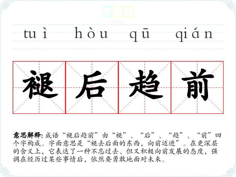 成语“褪后趋前”由“褪”、“后”、“趋”、“前”四个字构成。字面意思是“褪去后面的东西,向前迈进”。在更深层的含义上,它表达了一种不忘过去、但又积极向前发展的态度,强调在经历过某些事情后,依然要勇敢地面对未来。