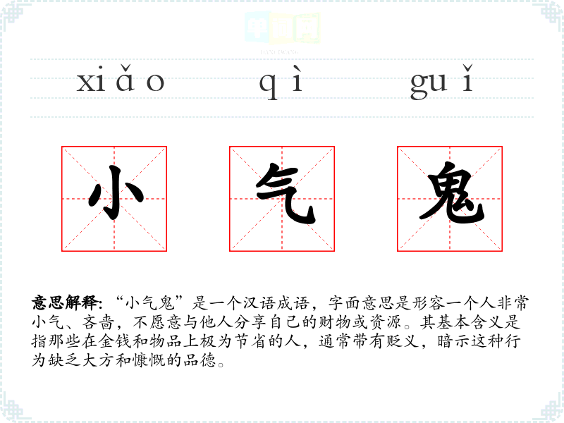 “小气鬼”是一个汉语成语,字面意思是形容一个人非常小气、吝啬,不愿意与他人分享自己的财物或资源。其基本含义是指那些在金钱和物品上极为节省的人,通常带有贬义,暗示这种行为缺乏大方和慷慨的品德。