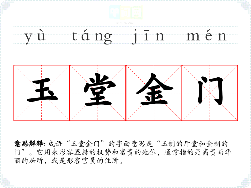 成语“玉堂金门”的字面意思是“玉制的厅堂和金制的门”。它用来形容显赫的权势和富贵的地位,通常指的是高贵而华丽的居所,或是形容官员的住所。