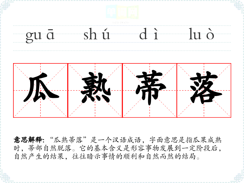 “瓜熟蒂落”是一个汉语成语,字面意思是指瓜果成熟时,蒂部自然脱落。它的基本含义是形容事物发展到一定阶段后,自然产生的结果,往往暗示事情的顺利和自然而然的结局。
