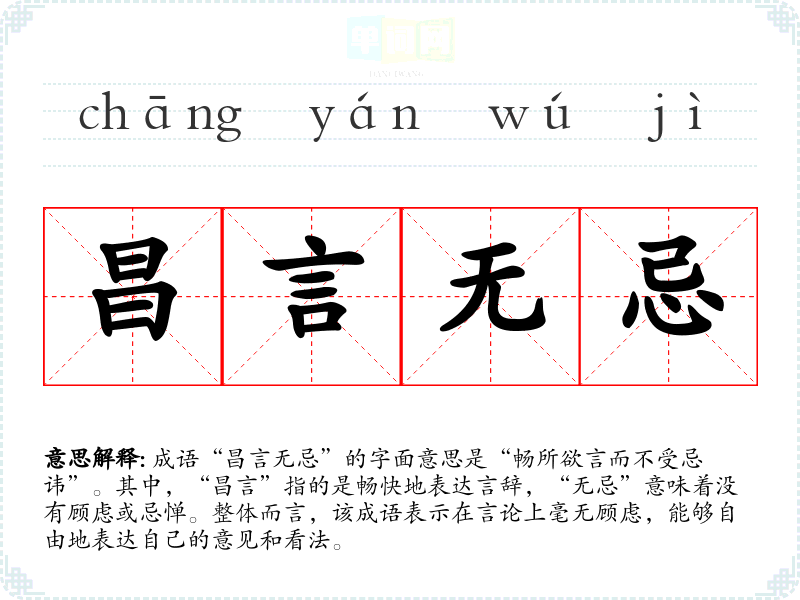 成语“昌言无忌”的字面意思是“畅所欲言而不受忌讳”。其中,“昌言”指的是畅快地表达言辞,“无忌”意味着没有顾虑或忌惮。整体而言,该成语表示在言论上毫无顾虑,能够自由地表达自己的意见和看法。