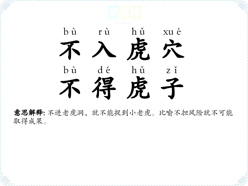 | 不入虎穴,焉得虎子 | 焉:怎么。不进老虎窝,怎能捉到小老虎。比喻不亲历险境就不能获得成功。 |