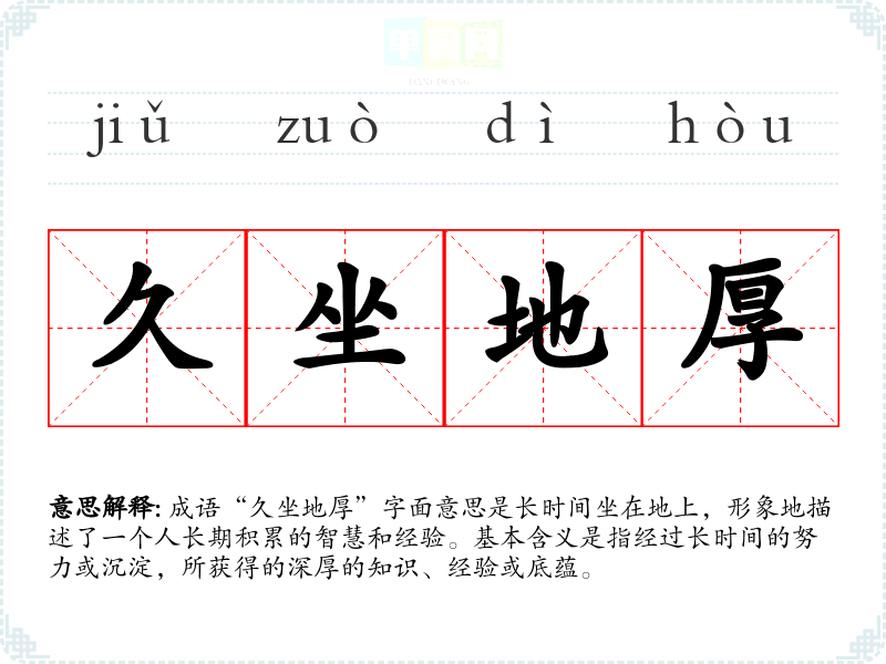 成语“久坐地厚”字面意思是长时间坐在地上,形象地描述了一个人长期积累的智慧和经验。基本含义是指经过长时间的努力或沉淀,所获得的深厚的知识、经验或底蕴。