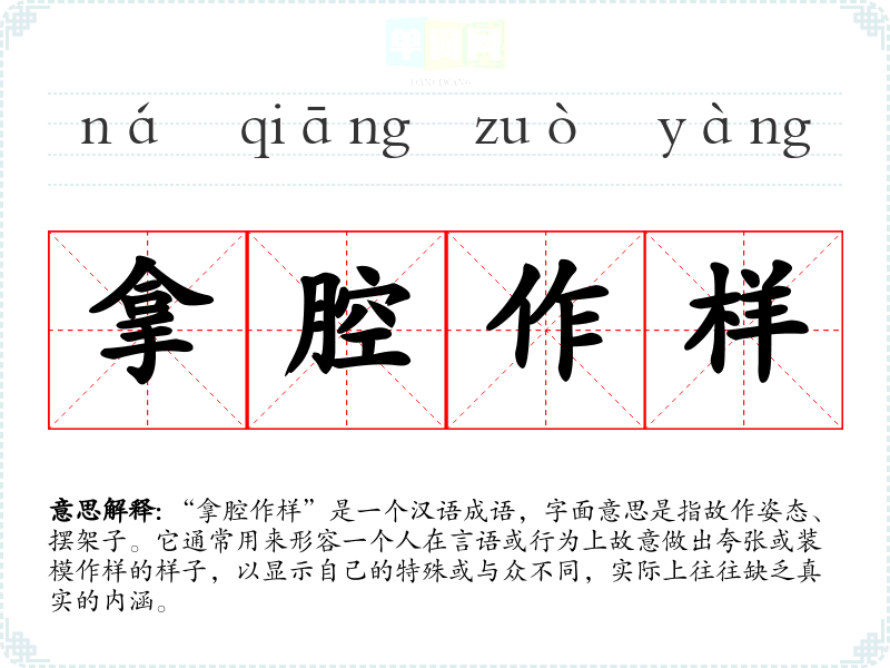 “拿腔作样”是一个汉语成语,字面意思是指故作姿态、摆架子。它通常用来形容一个人在言语或行为上故意做出夸张或装模作样的样子,以显示自己的特殊或与众不同,实际上往往缺乏真实的内涵。