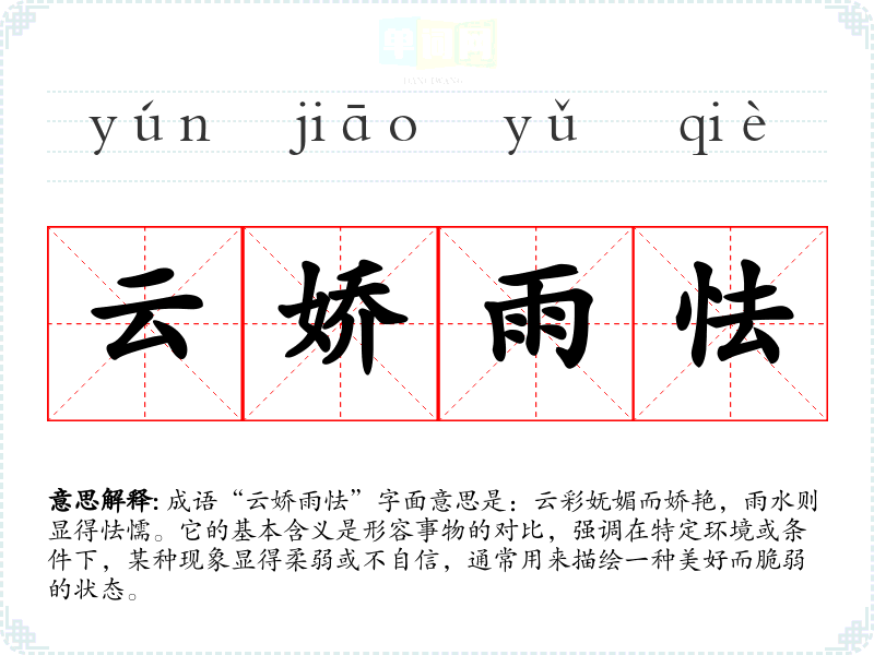 成语“云娇雨怯”字面意思是:云彩妩媚而娇艳,雨水则显得怯懦。它的基本含义是形容事物的对比,强调在特定环境或条件下,某种现象显得柔弱或不自信,通常用来描绘一种美好而脆弱的状态。