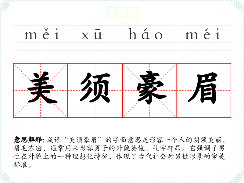 成语“美须豪眉”的字面意思是形容一个人的胡须美丽,眉毛浓密,通常用来形容男子的外貌英俊、气宇轩昂。它强调了男性在外貌上的一种理想化特征,体现了古代社会对男性形象的审美标准。