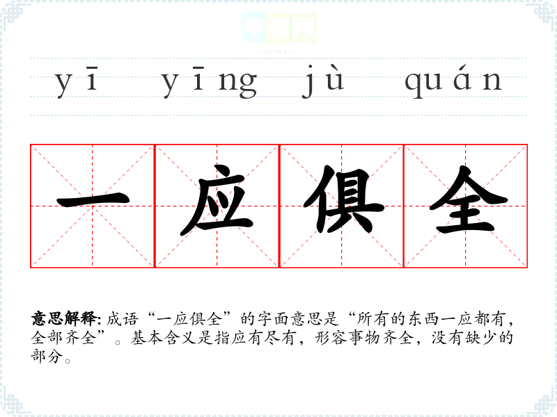 | 一应俱全 | 一应:一切;俱:都。一切齐全,应有尽有。 |