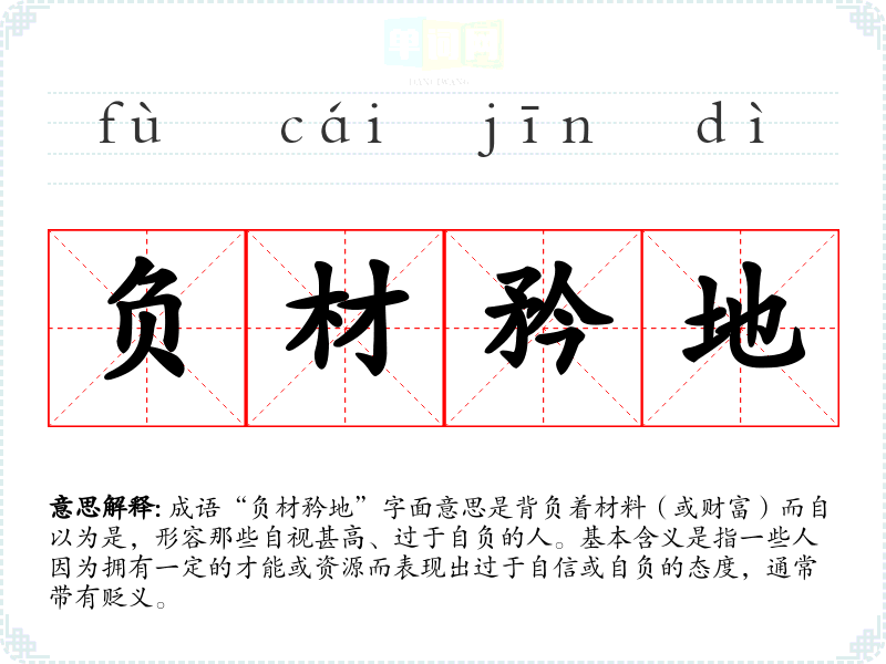 成语“负材矜地”字面意思是背负着材料(或财富)而自以为是,形容那些自视甚高、过于自负的人。基本含义是指一些人因为拥有一定的才能或资源而表现出过于自信或自负的态度,通常带有贬义。