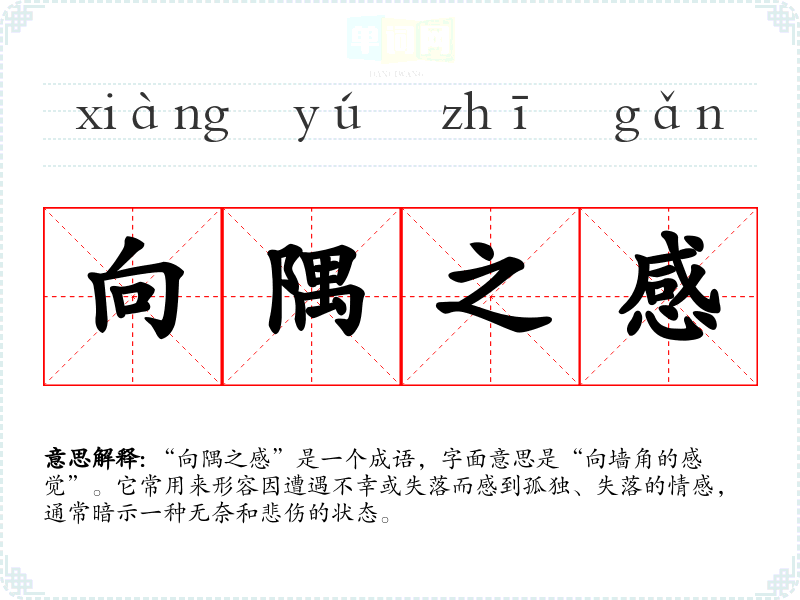“向隅之感”是一个成语,字面意思是“向墙角的感觉”。它常用来形容因遭遇不幸或失落而感到孤独、失落的情感,通常暗示一种无奈和悲伤的状态。