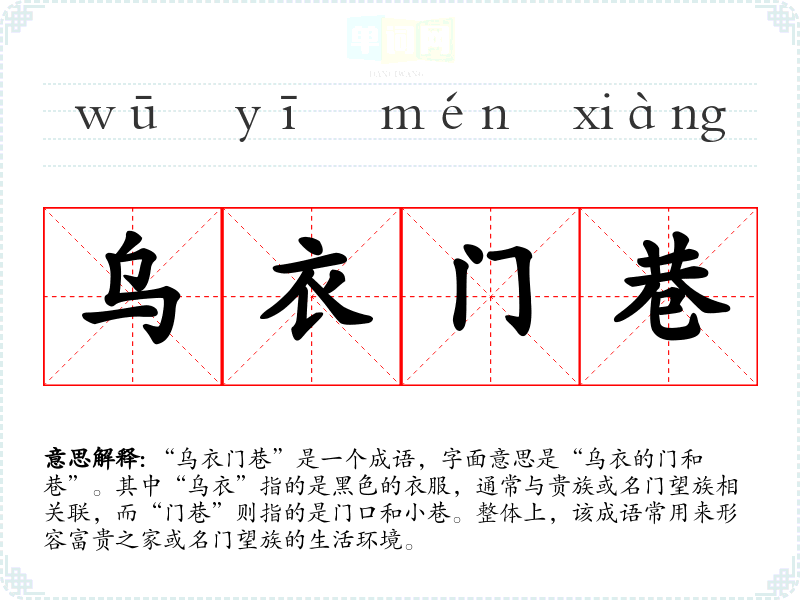 “乌衣门巷”是一个成语,字面意思是“乌衣的门和巷”。其中“乌衣”指的是黑色的衣服,通常与贵族或名门望族相关联,而“门巷”则指的是门口和小巷。整体上,该成语常用来形容富贵之家或名门望族的生活环境。