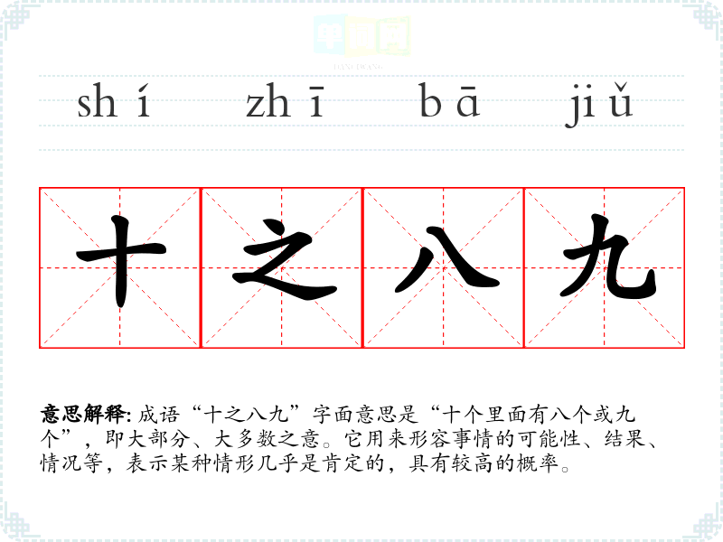 | 十之八九 | 比喻有极大的可能性。 |