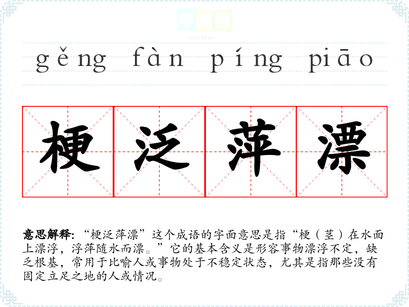 “梗泛萍漂”这个成语的字面意思是指“梗(茎)在水面上漂浮,浮萍随水而漂。”它的基本含义是形容事物漂浮不定,缺乏根基,常用于比喻人或事物处于不稳定状态,尤其是指那些没有固定立足之地的人或情况。