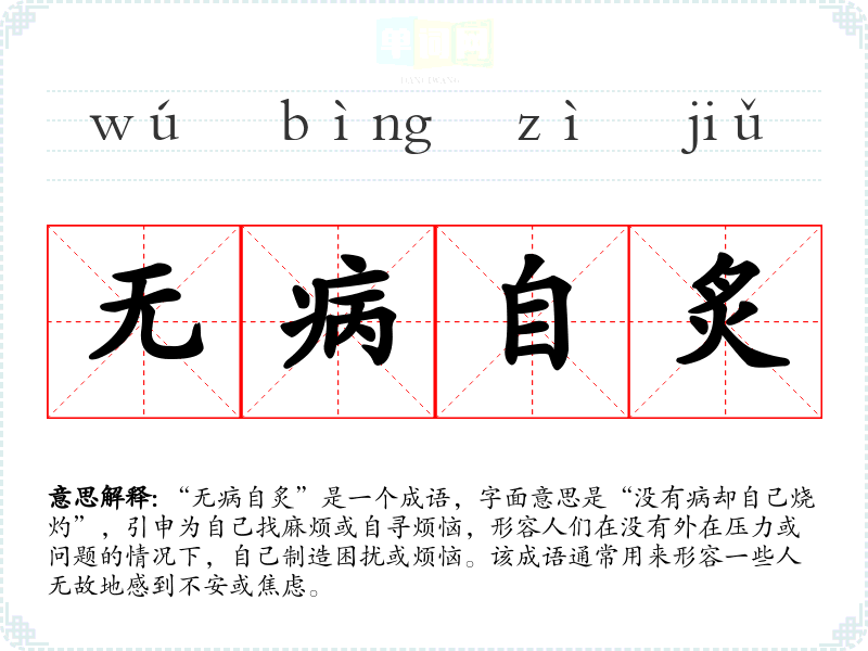 “无病自炙”是一个成语,字面意思是“没有病却自己烧灼”,引申为自己找麻烦或自寻烦恼,形容人们在没有外在压力或问题的情况下,自己制造困扰或烦恼。该成语通常用来形容一些人无故地感到不安或焦虑。