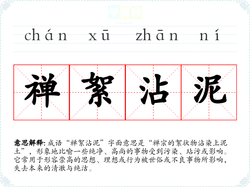 成语“禅絮沾泥”字面意思是“禅宗的絮状物沾染上泥土”,形象地比喻一些纯净、高尚的事物受到污染、玷污或影响。它常用于形容崇高的思想、理想或行为被世俗或不良事物所影响,失去本来的清澈与纯洁。