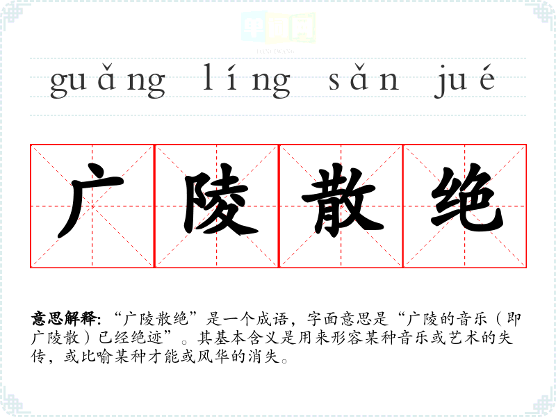 | 广陵散绝 | 《广陵散》已失传。常比喻优良传统断绝或后继无人。 |