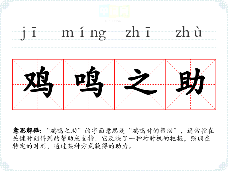 “鸡鸣之助”的字面意思是“鸡鸣时的帮助”,通常指在关键时刻得到的帮助或支持。它反映了一种对时机的把握,强调在特定的时刻,通过某种方式获得的助力。