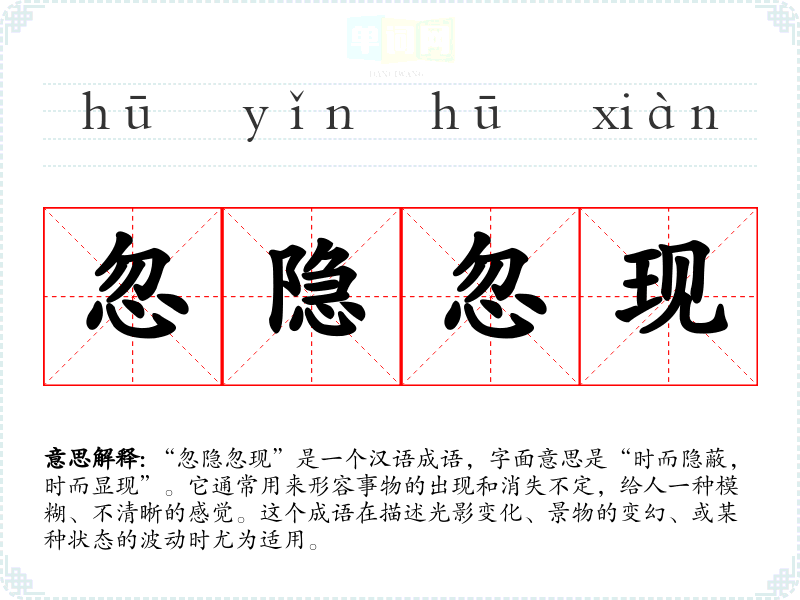 “忽隐忽现”是一个汉语成语,字面意思是“时而隐蔽,时而显现”。它通常用来形容事物的出现和消失不定,给人一种模糊、不清晰的感觉。这个成语在描述光影变化、景物的变幻、或某种状态的波动时尤为适用。