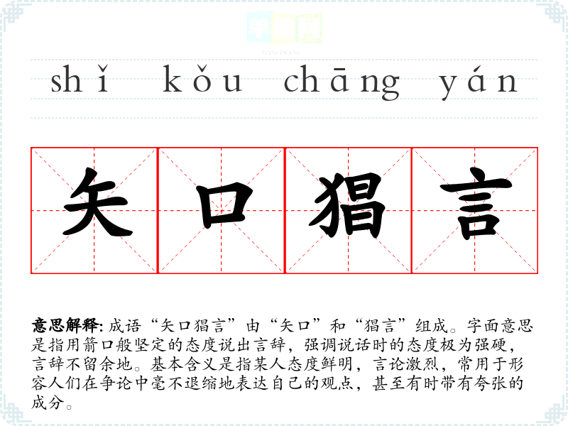 “矢口猖言”出自《左传》,原文为“矢口不移”,意在形容说话时立场坚定、不容置疑。通过历史文献可以看出,这个成语在古代就被用于形容口才与言辞的强烈,随着时间的推移,它的含义逐渐被扩展到对言辞态度的描述上。