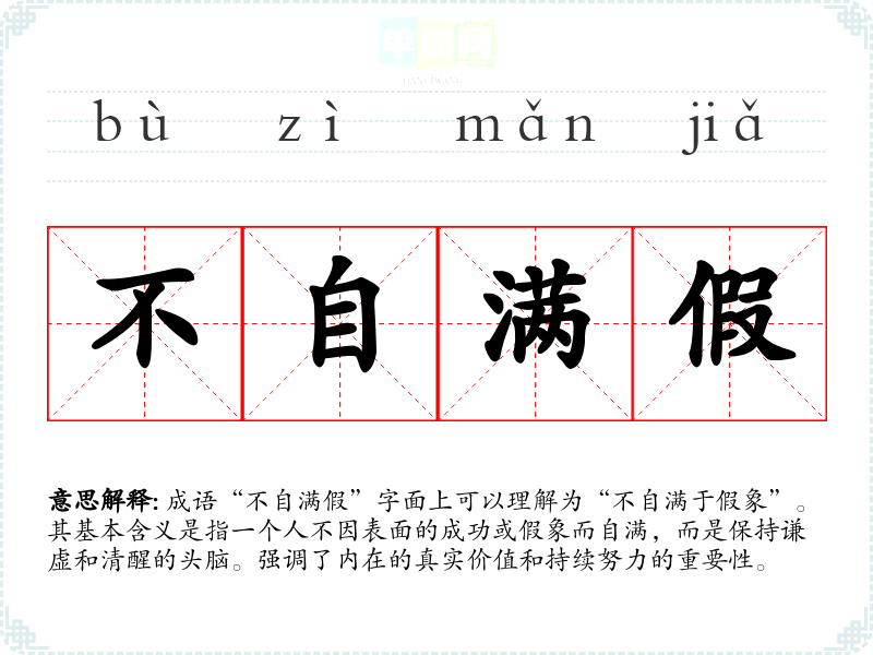 成语“不自满假”字面上可以理解为“不自满于假象”。其基本含义是指一个人不因表面的成功或假象而自满,而是保持谦虚和清醒的头脑。强调了内在的真实价值和持续努力的重要性。
