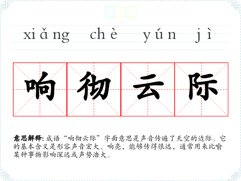 成语“响彻云际”字面意思是声音传遍了天空的边际。它的基本含义是形容声音宏大、响亮,能够传得很远,通常用来比喻某种事物影响深远或声势浩大。