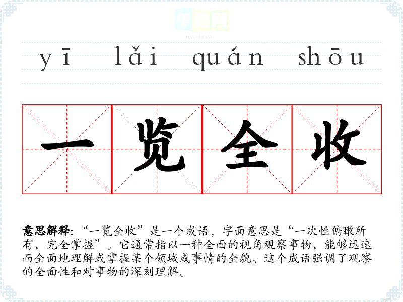 通过对“一览全收”的学习,我认识到它不仅是一种观察和理解的方式,也是一种对待知识和信息的态度。在语言学习和表达中,追求全面性和深刻理解是非常重要的,这有助于我们更好地与他人沟通和分享观点。