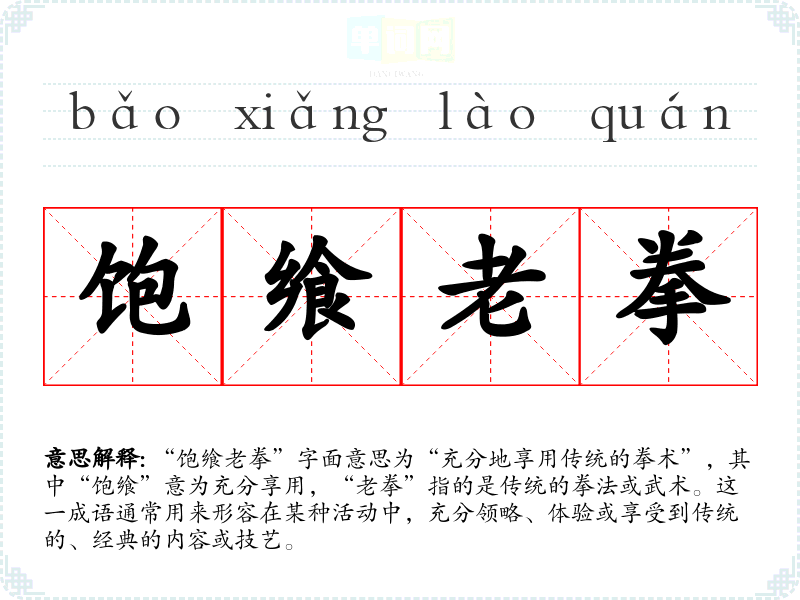 “饱飨老拳”字面意思为“充分地享用传统的拳术”,其中“饱飨”意为充分享用,“老拳”指的是传统的拳法或武术。这一成语通常用来形容在某种活动中,充分领略、体验或享受到传统的、经典的内容或技艺。