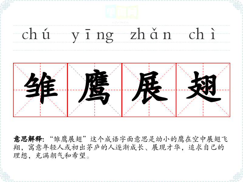 “雏鹰展翅”这个成语字面意思是幼小的鹰在空中展翅飞翔,寓意年轻人或初出茅庐的人逐渐成长、展现才华,追求自己的理想,充满朝气和希望。