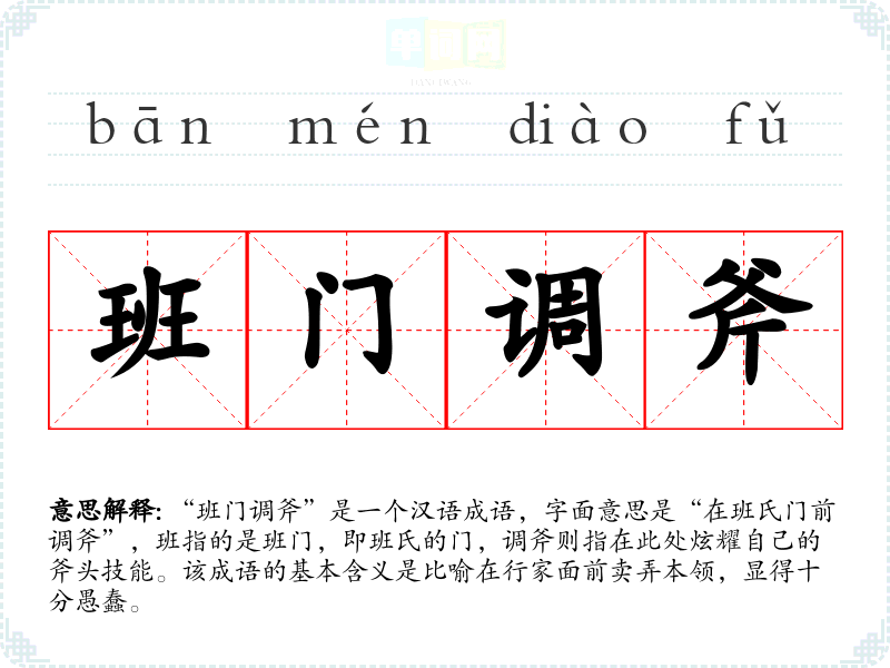 | 班门调斧 | 班:鲁班,春秋时期鲁国人,著名的木匠;调:耍弄。在鲁班门前舞弄斧子。比喻在行家面前卖弄本领,不自量力 |