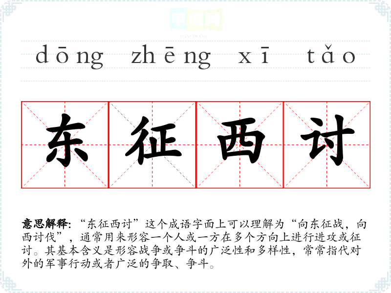 “东征西讨”这个成语字面上可以理解为“向东征战,向西讨伐”,通常用来形容一个人或一方在多个方向上进行进攻或征讨。其基本含义是形容战争或争斗的广泛性和多样性,常常指代对外的军事行动或者广泛的争取、争斗。
