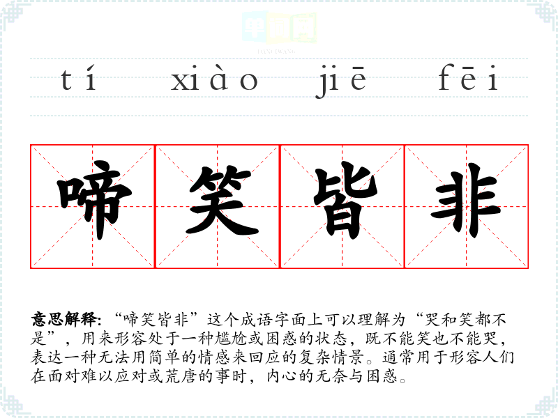 | 啼笑皆非 | 啼:哭;皆非:都不是。哭也不是,笑也不是,不知如何才好。形容处境尴尬或既令人难受又令人发笑的行为。 |