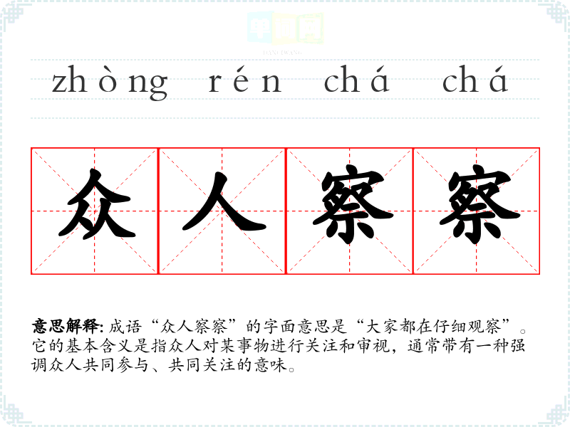 成语“众人察察”的字面意思是“大家都在仔细观察”。它的基本含义是指众人对某事物进行关注和审视,通常带有一种强调众人共同参与、共同关注的意味。