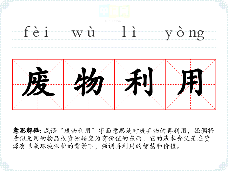 成语“废物利用”字面意思是对废弃物的再利用,强调将看似无用的物品或资源转变为有价值的东西。它的基本含义是在资源有限或环境保护的背景下,强调再利用的智慧和价值。