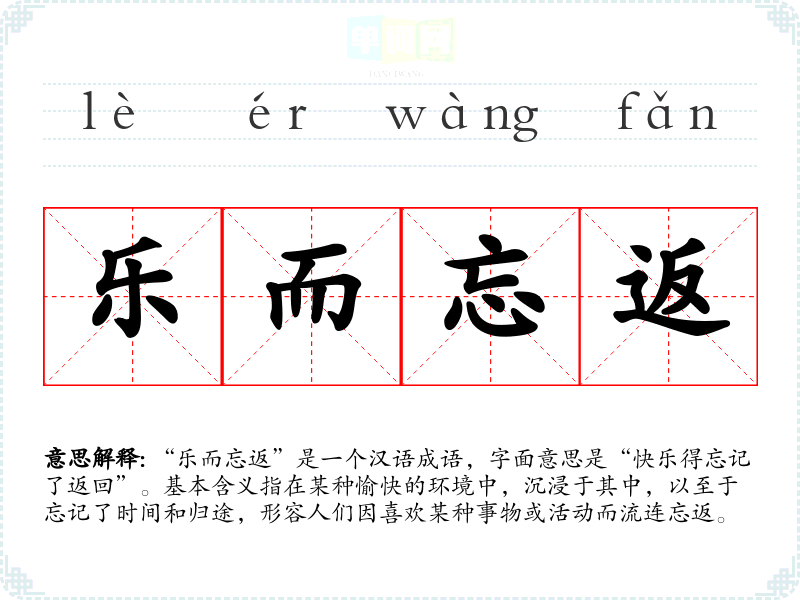 “乐而忘返”让我联想到童年时的无忧无虑,常常在公园中玩耍,直到天黑才回家。它传达了一种自由、愉悦的情感,鼓励人们去追求和享受生活中的小确幸。