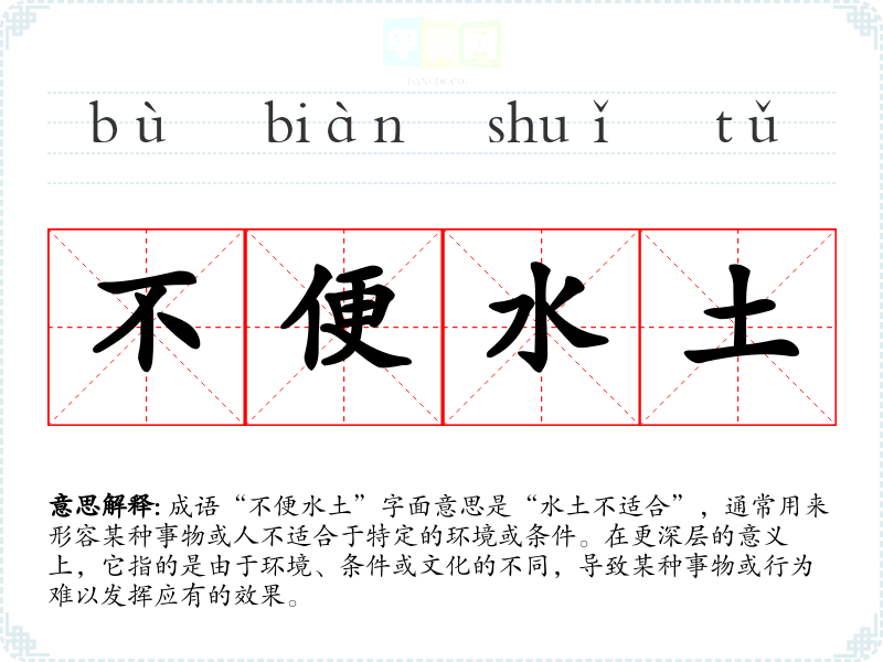 成语“不便水土”字面意思是“水土不适合”,通常用来形容某种事物或人不适合于特定的环境或条件。在更深层的意义上,它指的是由于环境、条件或文化的不同,导致某种事物或行为难以发挥应有的效果。