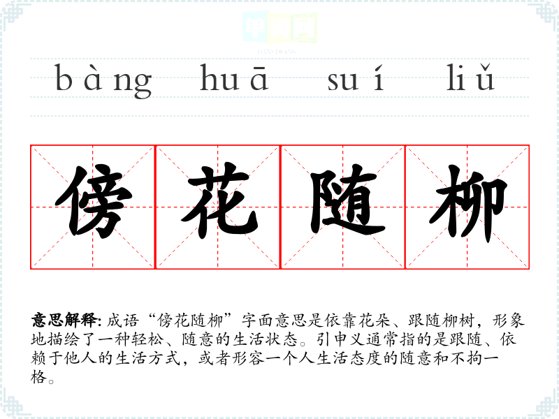 成语“傍花随柳”字面意思是依靠花朵、跟随柳树,形象地描绘了一种轻松、随意的生活状态。引申义通常指的是跟随、依赖于他人的生活方式,或者形容一个人生活态度的随意和不拘一格。
