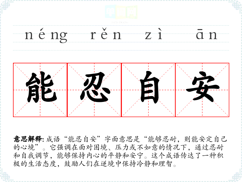 成语“能忍自安”字面意思是“能够忍耐,则能安定自己的心境”。它强调在面对困境、压力或不如意的情况下,通过忍耐和自我调节,能够保持内心的平静和安宁。这个成语传达了一种积极的生活态度,鼓励人们在逆境中保持冷静和理智。