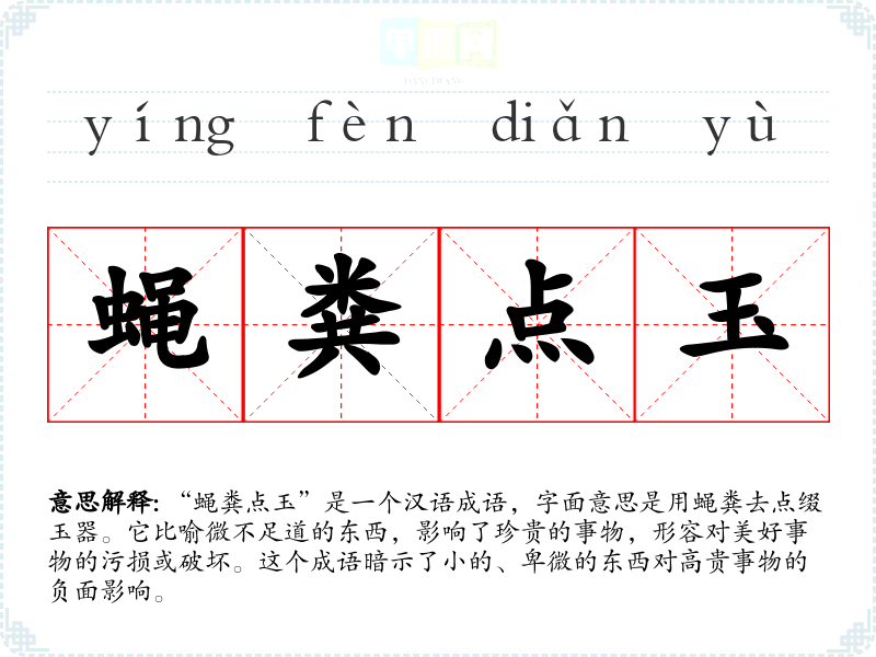 “蝇粪点玉”是一个汉语成语,字面意思是用蝇粪去点缀玉器。它比喻微不足道的东西,影响了珍贵的事物,形容对美好事物的污损或破坏。这个成语暗示了小的、卑微的东西对高贵事物的负面影响。