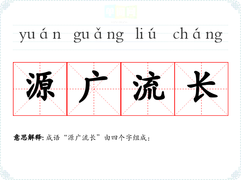 字面意思是水源广阔,流淌得很长,基本含义则是比喻事物的来源广泛且延续时间长久,常用来形容文化、传统、知识、思想等的深厚和长久。