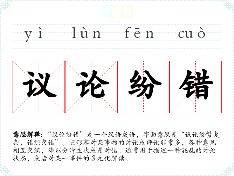“议论纷错”是一个汉语成语,字面意思是“议论纷繁复杂、错综交错”。它形容对某事物的讨论或评论非常多,各种意见相互交织,难以分清主次或是对错。通常用于描述一种混乱的讨论状态,或者对某一**的多元化解读。